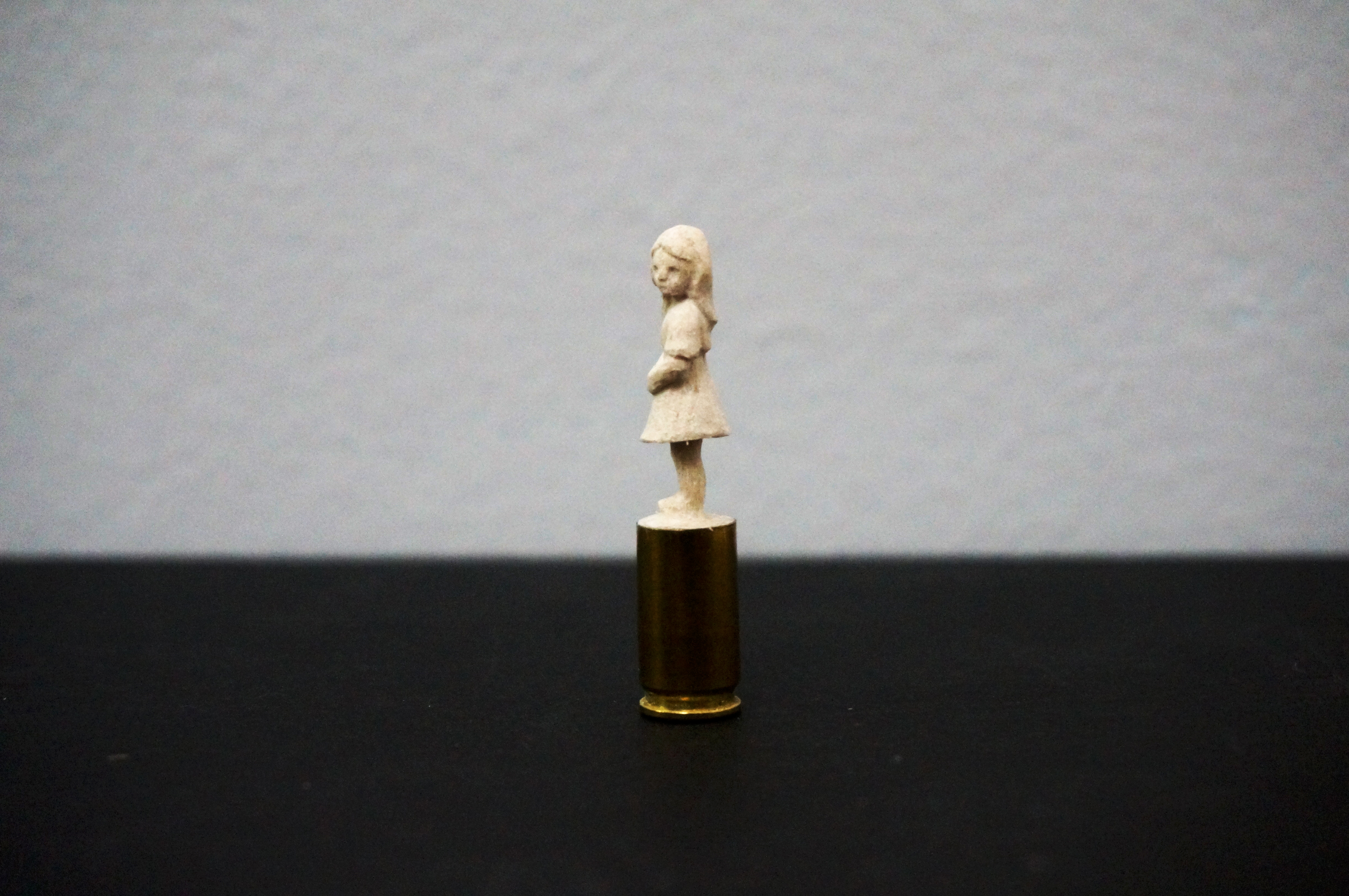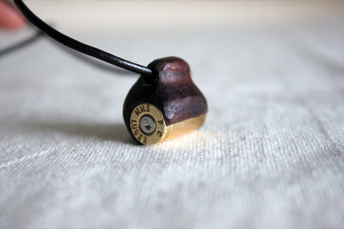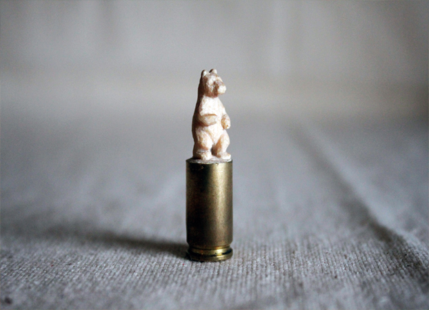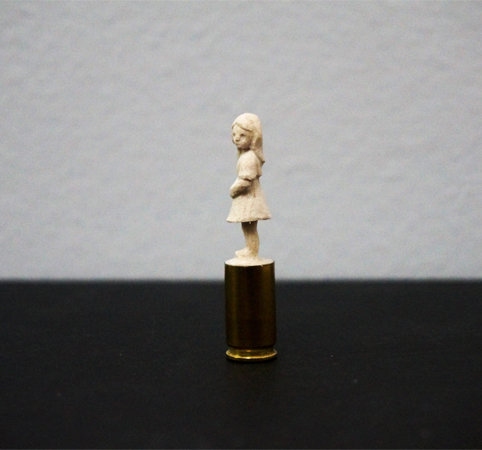 Wooden sculpture on 9mm gun casing.